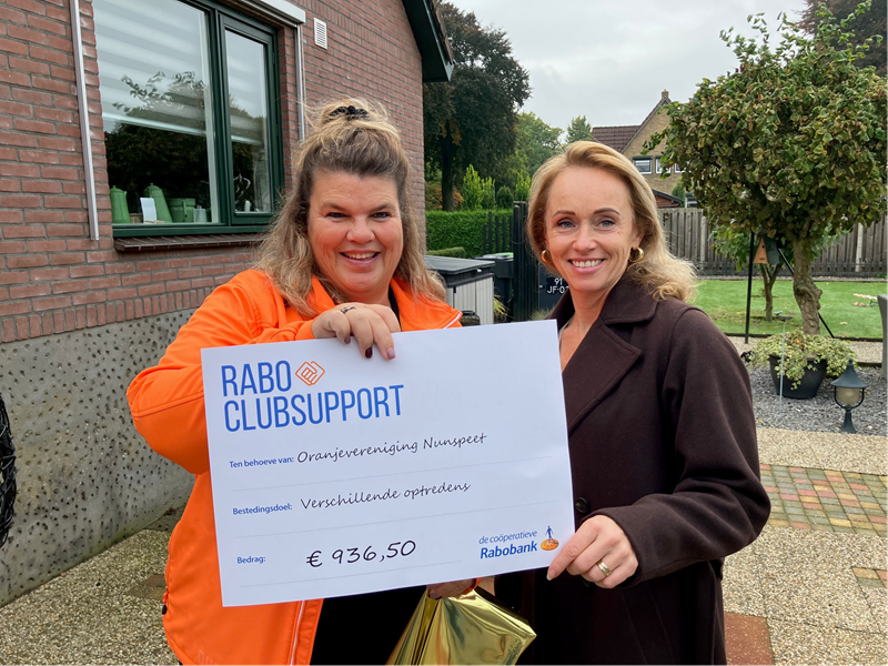 Vanmiddag kreeg onze penningmeester Jacolien Ponsteen uit handen van Nathalie Aarts van de Rabobank een waarde cheque van € 936,50 overhandigd.
