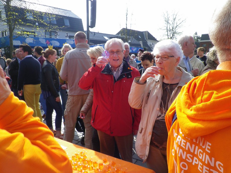 Op de foto: Dries van Klompenburg en zijn vrouw genieten op Koningsdag 2014 van een oranjebittertje na de aubade op het Marktplein.