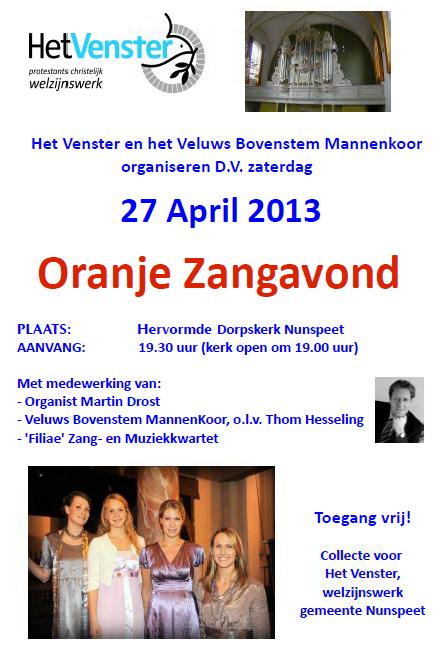 In de Hervormde Dorpskerk in Nunspeet vindt op zaterdag 27 april aanstaande, vanaf 19.30 uur een zangavond plaats die in het teken staat van Oranje!