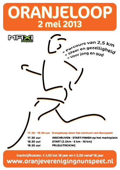 Voor de 3e keer in successie staat de Oranjeloop Nunspeet, met start en finish vanaf het geheel vernieuwde Marktplein, op het programma van de festiviteiten op en rondom Koninginnedag 2013 in Nunspeet.