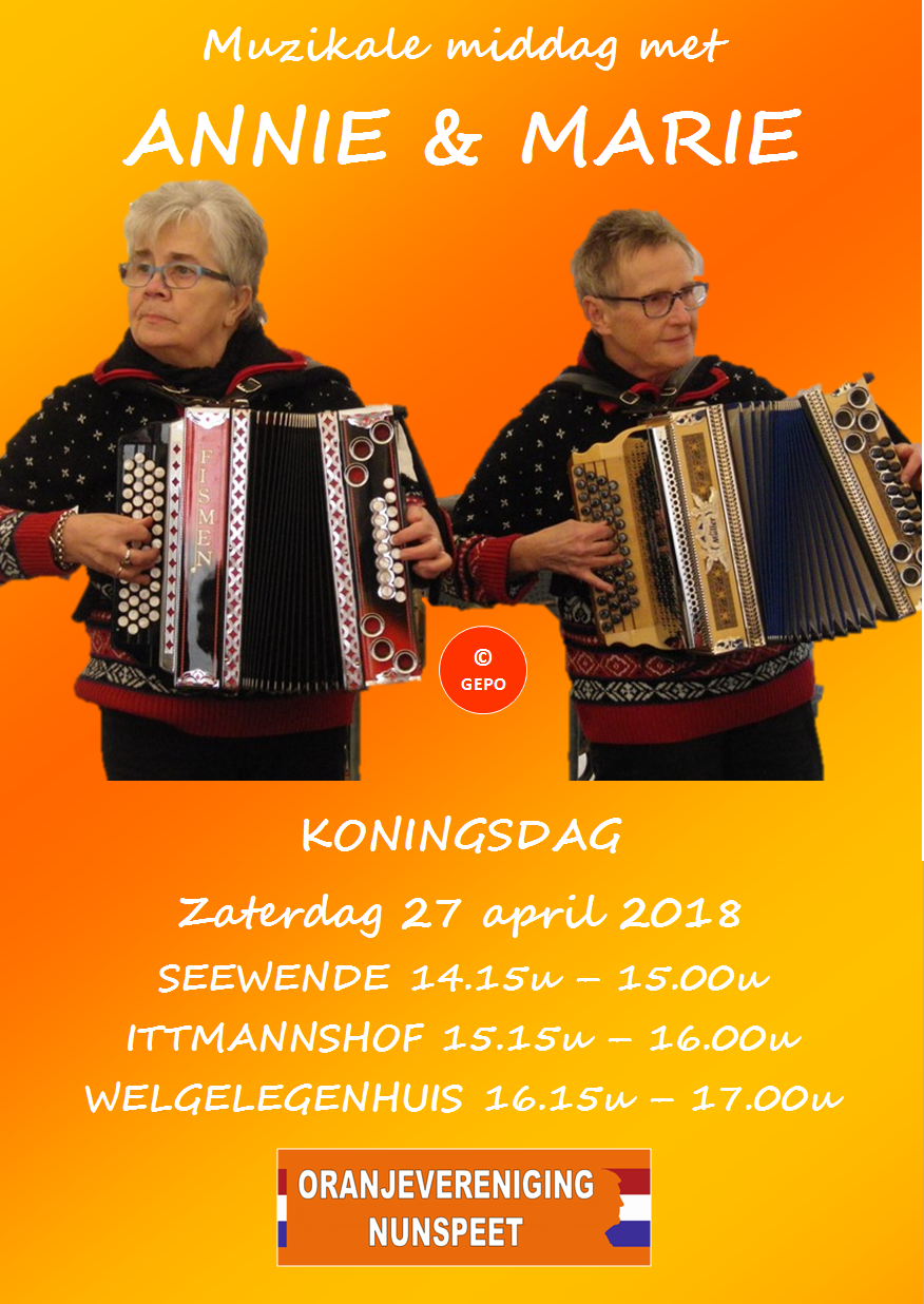 Geen categorie UITGELICHT: Annie en Marie 14 april 2019 1 min. lezen 936 Het vrolijke harmonica duo Annie en Marie zullen de bewoners van Seewende, Ittmannshof en het Welgelegenhuis trakteren op een mooi optreden. In Seewende van 14.15-15.00 uur, in de Ittmannshof van 15.15-16.00 uur en in Het Welgelegenhuis van 16.15 tot 17.00 uur. Doorgaan met lezen Vorige Vorig bericht: UITGELICHT: OranjemarktVolgende Volgende bericht: QuErCo Reclame sponsort jassen voor het bestuur. Nu trending 1 Koningsdag aan een zijden draadje! 15 februari 2026 239 2 CONCEPT programma Koningsdag 2026 on-line 1 februari 2026 612 3 Alle stemmers hartelijk bedankt 8 oktober 2025 680 4 Afscheid voorzitter Henry Stulen 23 juni 2025 1421