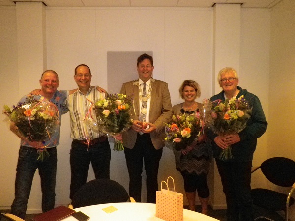 Het bestuur werd op maandag 22 mei in het gemeentehuis, tijdens de evaluatievergadering over Koningsdag 2017, door burgemeester Breunis v.d. Weerd en coördinator van het Servicepunt Vrijwilligers Nunspeet Marit Hofman overvallen met gebak en bloemen.